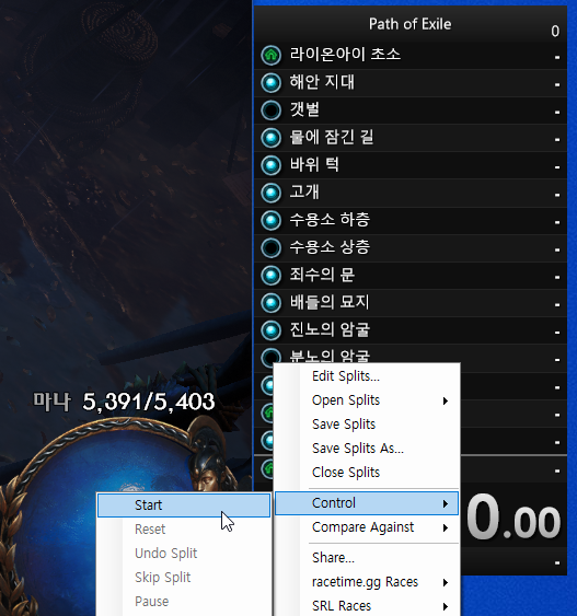 그리고 LiveSplit에서 우클릭 후 Control > Start를 클릭한다.